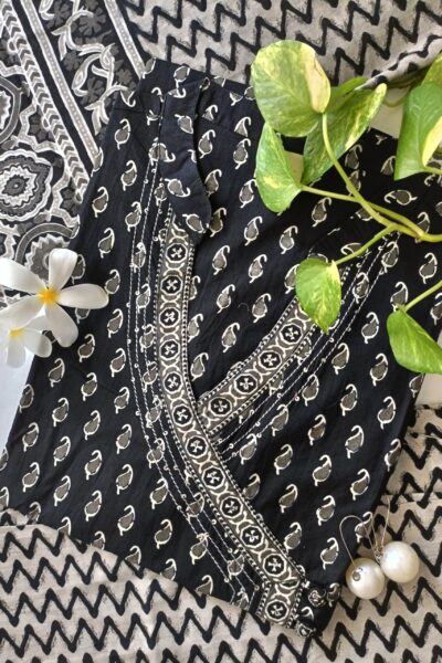 Black Bagru Hand Block Pritned Angrakha Kurta Set(3pc)