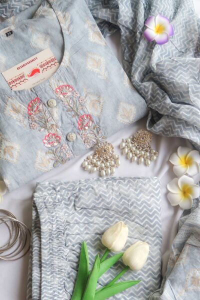 Introducing the “Sky Blossom Ensemble” – a captivating ode to ethereal beauty and timeless grace. Crafted from the finest cotton fabric, this kurta pants set exudes effortless elegance with its enchanting design and delicate detailing.