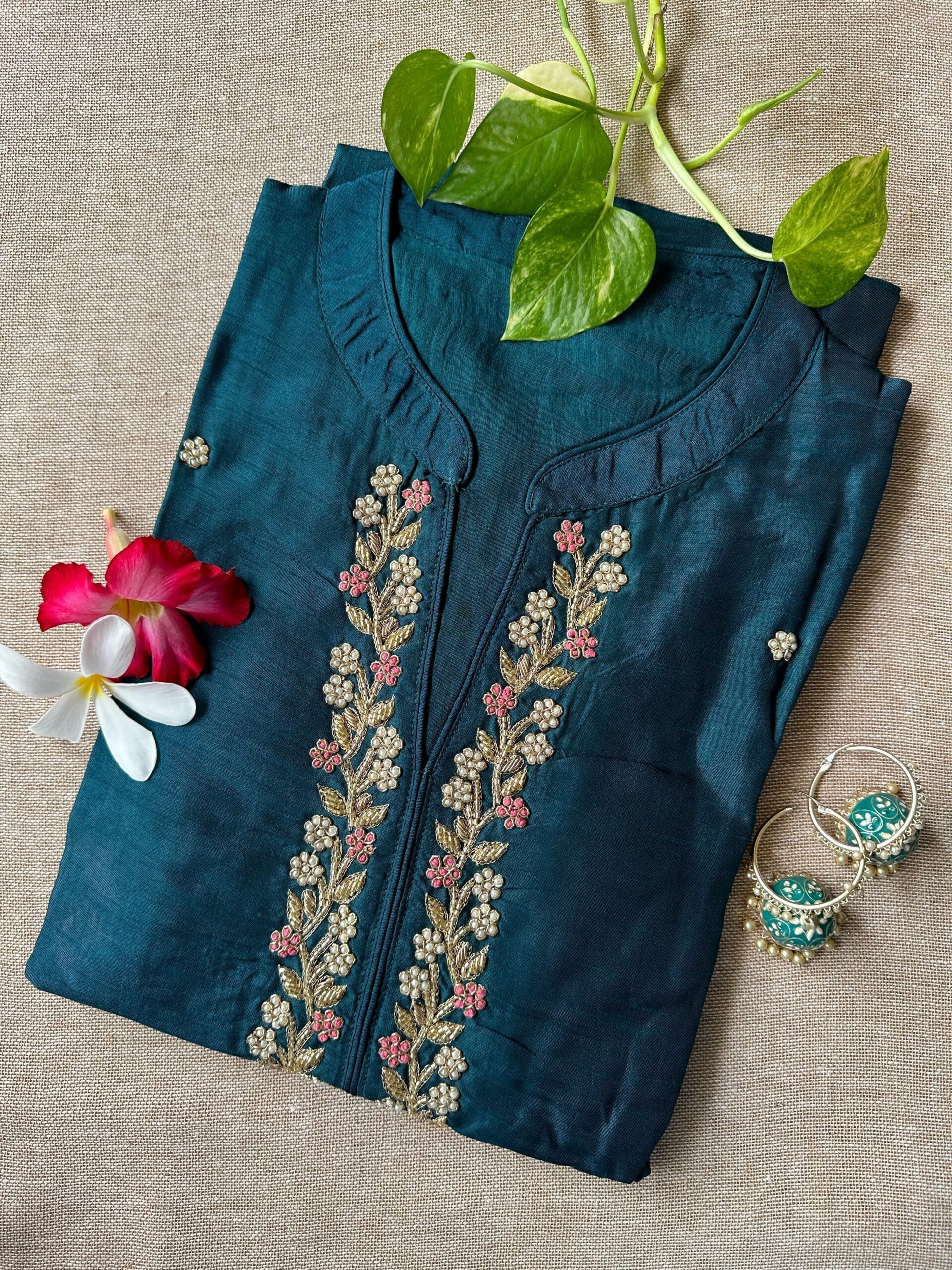 “Meena” Hand Embroidered Turquoise Silk Kurta