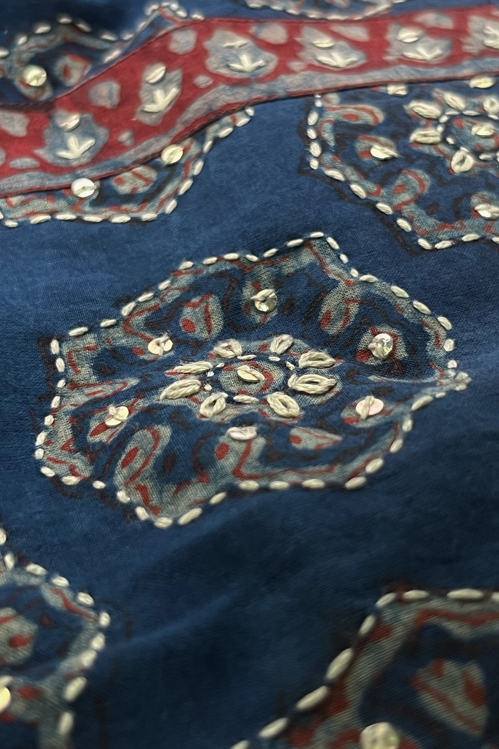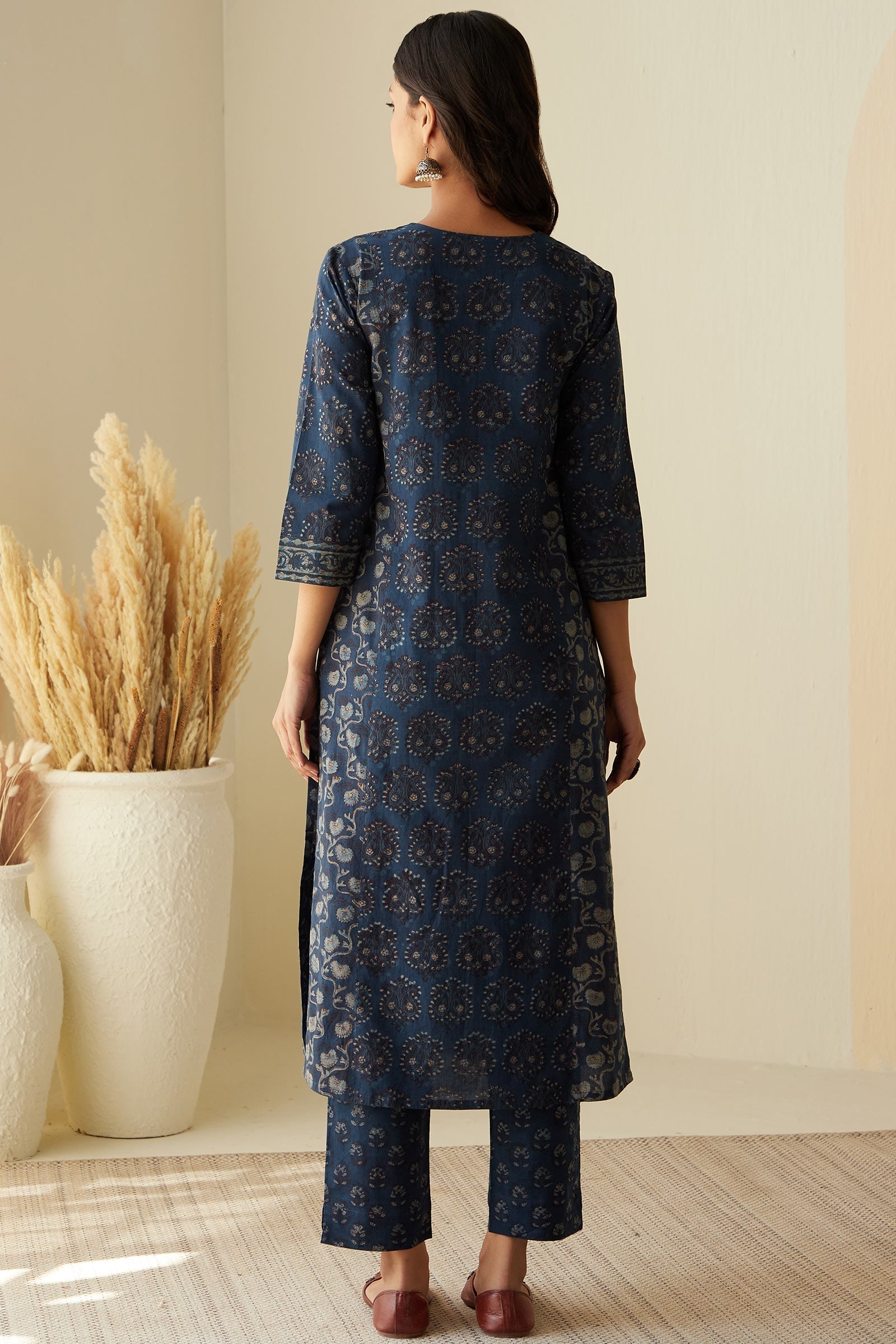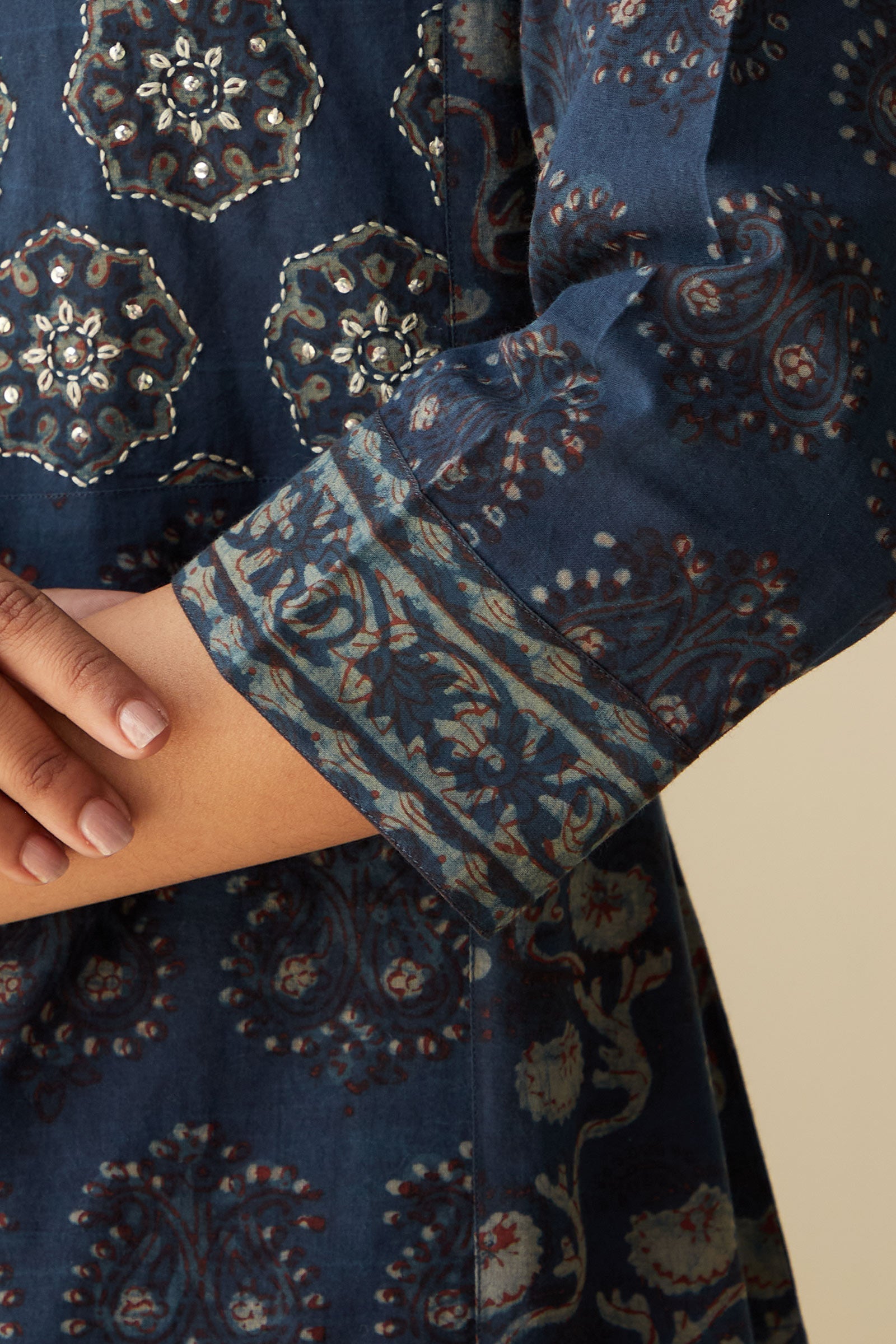 DISCLAIMER: Products printed with the craft involving Ajrak, Bagru, and Akola techniques may bleed during the first few washes or rub against the skin and other light-colored garments. These products may also react to sweat, potentially leading to discoloration over time. Additionally, all hand-printed items naturally tend to lose color with each wash, which is an inherent characteristic of these products. As our items undergo meticulous processes of hand block-printing, embroidery work, and stitching, variations are likely to occur, enhancing the uniqueness of each style. These inherent irregularities are characteristic of all handmade products, providing each piece with a distinct identity.